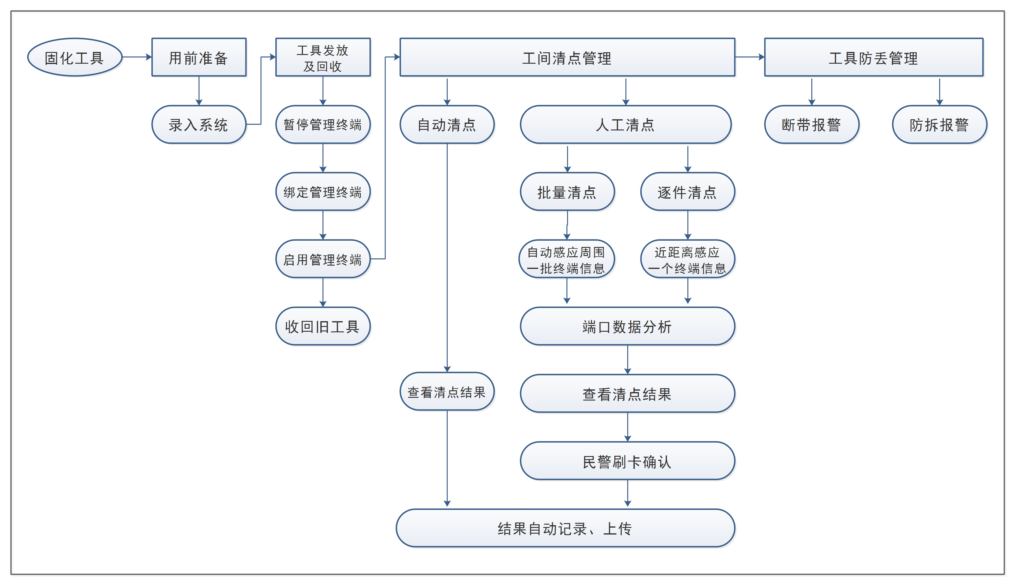 本次項(xiàng)目擬建設(shè)一套勞動(dòng)工具管理系統(tǒng),并通過本系統(tǒng)與人工管理的結(jié)合實(shí)現(xiàn)嚴(yán)格的勞動(dòng)工具管理。系統(tǒng)從勞動(dòng)工具的發(fā)放至工具的回收,提供全流程的管理方案。同時(shí),方案重點(diǎn)針對(duì)工具數(shù)量多、分布較為分散的實(shí)際給出智能化的管理方法,有效防范工具丟失的情況發(fā)生。系統(tǒng)通過降低管理過程中的人工參與,在減輕民警工作負(fù)擔(dān)的情況下實(shí)現(xiàn)工具的嚴(yán)格管理。